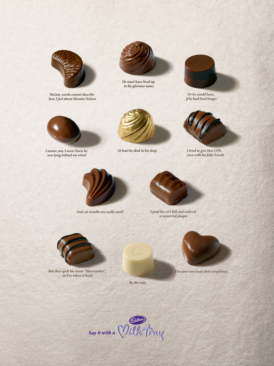 May 3, 2013 Cadbury Milk Tray “Sorry I ran over your cat.” Share this: Share on X (Opens in new window) X Share on Facebook (Opens in new window) Facebook Share on Threads (Opens in new window) Threads Share on WhatsApp (Opens in new window) WhatsApp Share on LinkedIn (Opens in new window) LinkedIn Like Loading... Related