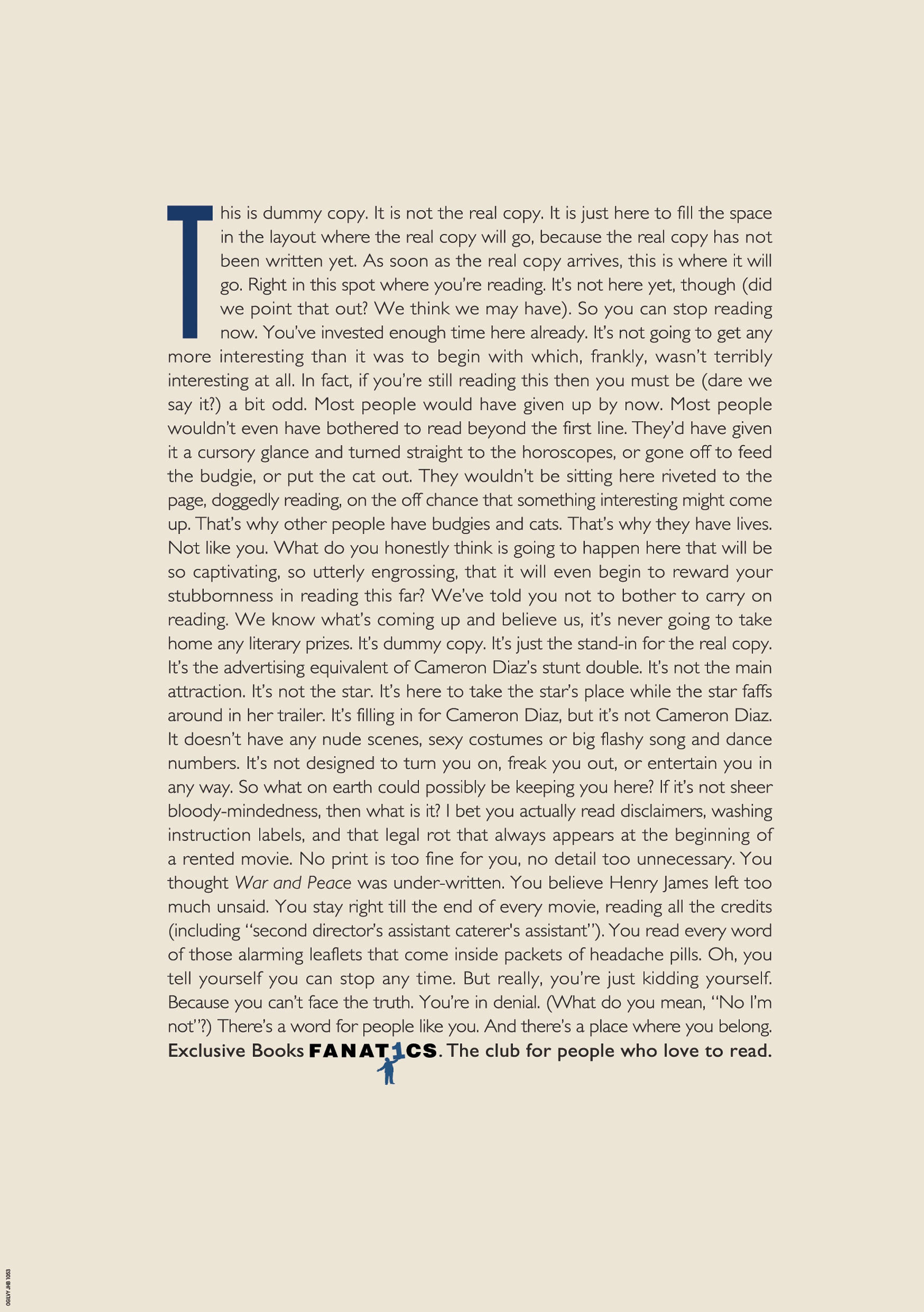 This is an early piece of work but still one of my favourites. I think the experience of writing it was one of the most enjoyable moments of my career.The Exclusive Books Fanatics Club is for people who love to read so much that they’ll read anything. Even the dummy copy that gets put into layouts to serve as a stand-in until the real copy gets written.